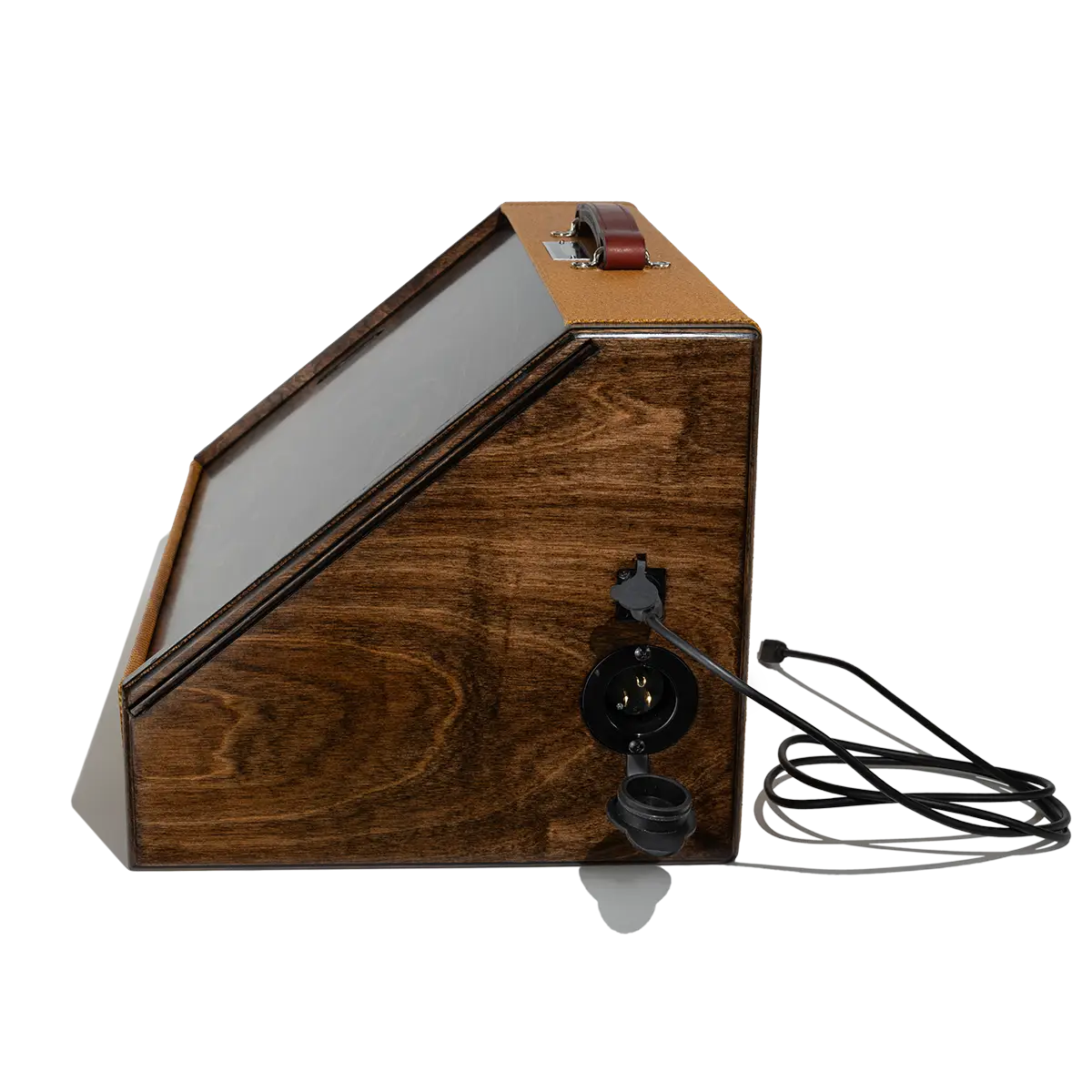 Sometimes called the musician’s teleprompter or confidence monitor. Seen from the back, the Slant Screen has been designed to be unobtrusive, blending in with sound equipment on stage. Lyrics scroll across the 24″ or 27″ high resolution screen from UnPromptu that can run within the program or interact with connected accessories like AirTurn via Bluetooth. Power Slant Screen with a NEMA 5-15 hookup and connect with UnPromptu by HDMI connection.